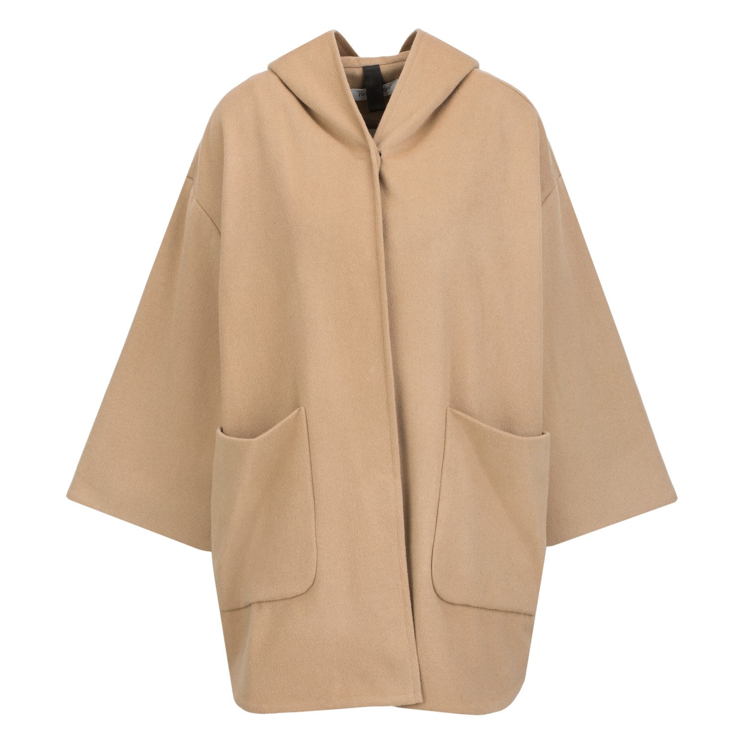 Es hat einen weiten Schnitt, eine Kapuze und 3/4 Ärmel. Die Taschen sind aufgesetzt. Verschlossen wird die Jacke mithilfe von Druckknöpfen in einer verdeckten Knopfleiste.