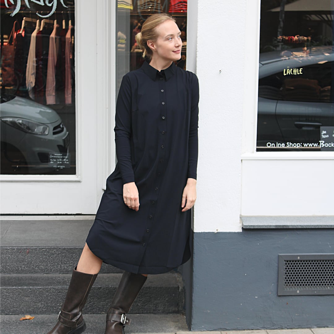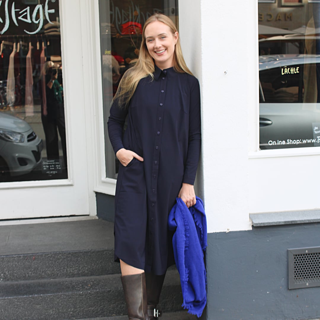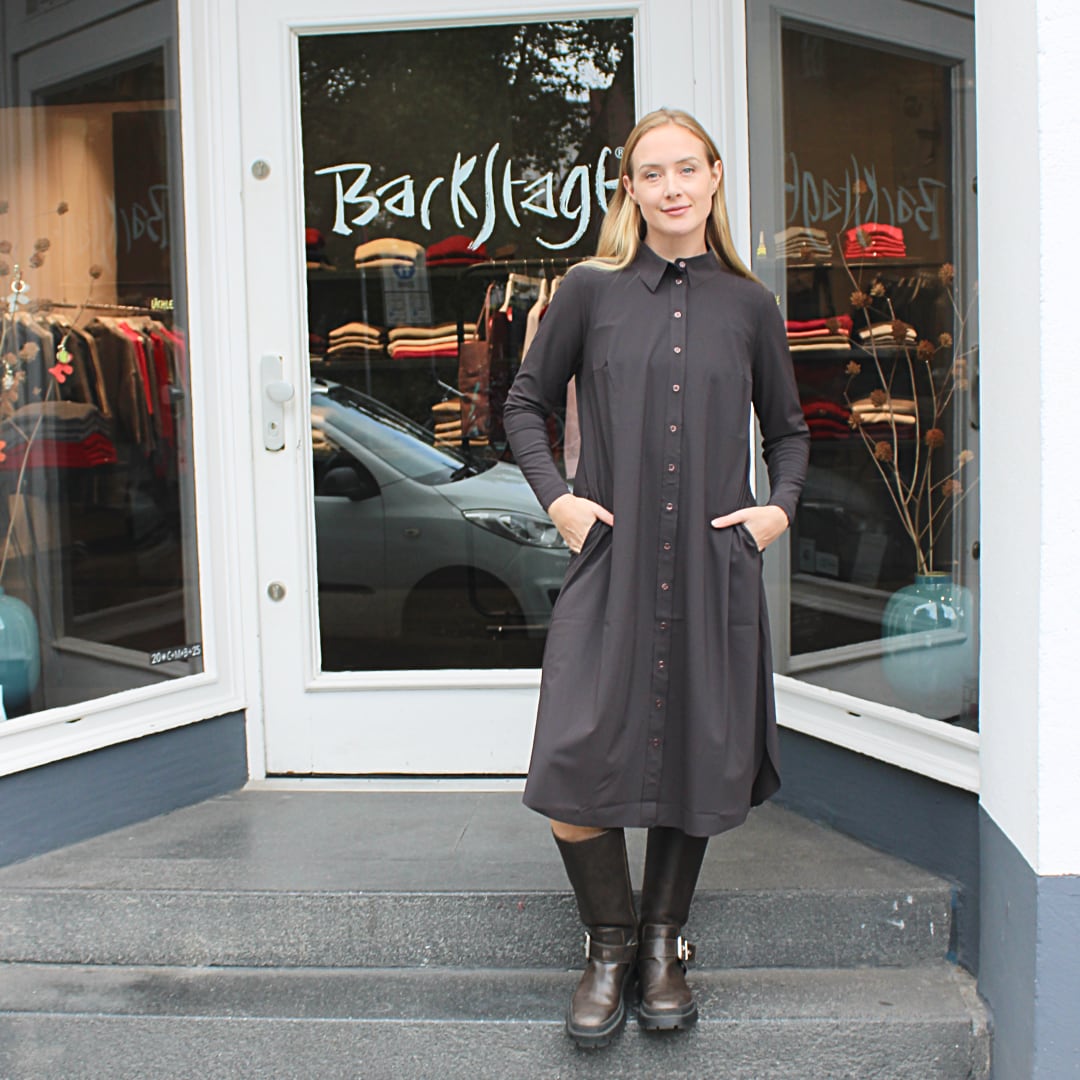 Es ist wie ein Hemdblusenkleid geschnitten, durchgeknöpft und hat seitliche Eingrifftaschen. Die langen Ärmel haben keine Manschette und lassen sich einfach in jede Höhe schoppen. An den Seiten hat das Kleid kleine Schlitze für mehr Beweglichkeit.