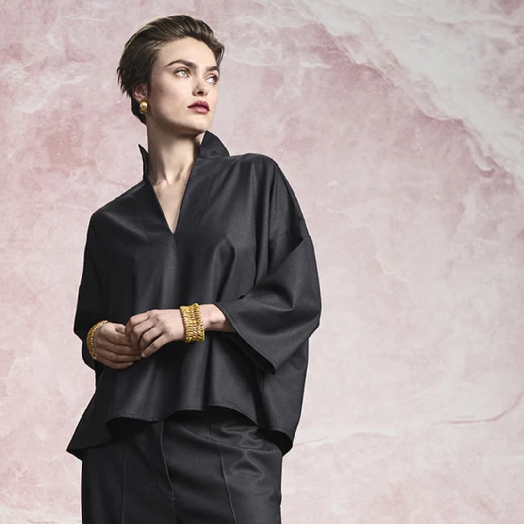 Das Material ist nachhaltig und waschbar, hat einen Look wie Wolle, ist aber knitterfrei. DAs Shirt hat einen V-Ausschnitt und einen Kragen.